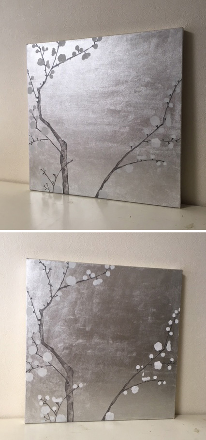キャンバス一面にアルミの箔を張り、梅の木を描いて見ました。横にも箔が貼ってあります。
