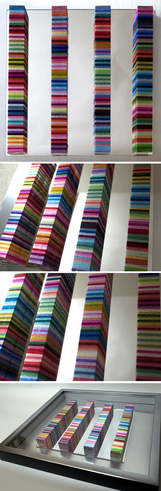 切ったアクリル棒に刺繍糸を巻きつけたものをアクリルミラー板に貼り合わせたもの