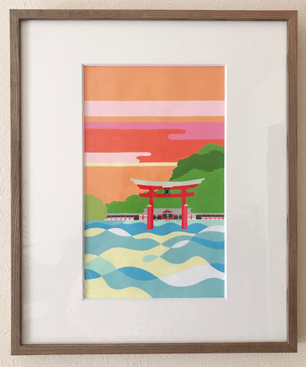 人気の高い、松尾たいこ氏のアクリル画です。2013年の広島シリーズから、宮島を描いたもの。松尾氏にとって特別な意味を持つ故郷の景色ですが、描画タッチは変わりません。 「私の原風景(出身地・広島)を描いたシリーズの一枚です。宮島の鳥居が海に浮かんでいる様子は、どの時間もとてもきれいです」(松尾氏)