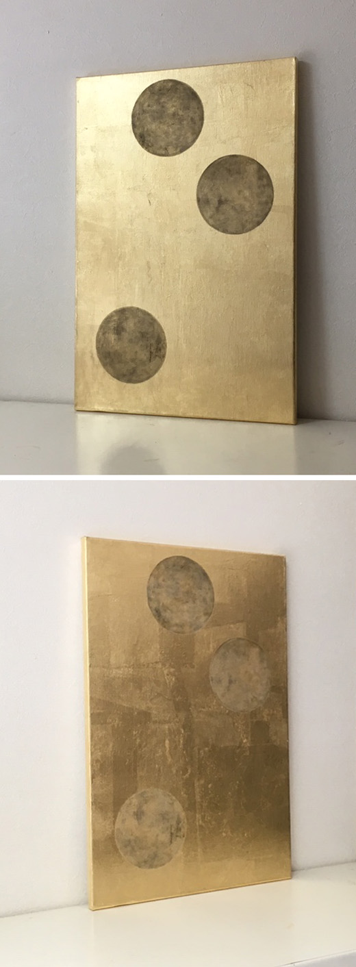 キャンバスに金色の箔を張り、その上に油彩で3つの月を描きました。