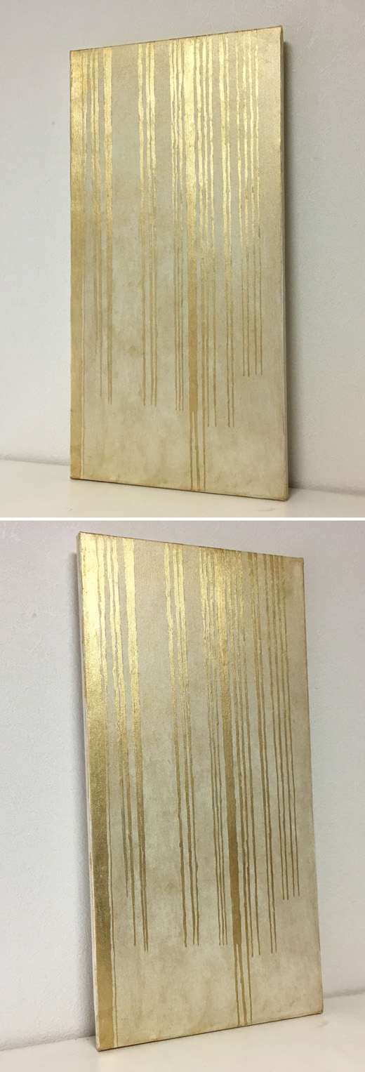 cascata とはイタリア語で滝の意味です。森の中で見かけるような小さい水の線がいくつもになって落ちていく細い滝のことを言います。キャンバスに金色の箔と油彩で抽象的に滝を表現してみました。