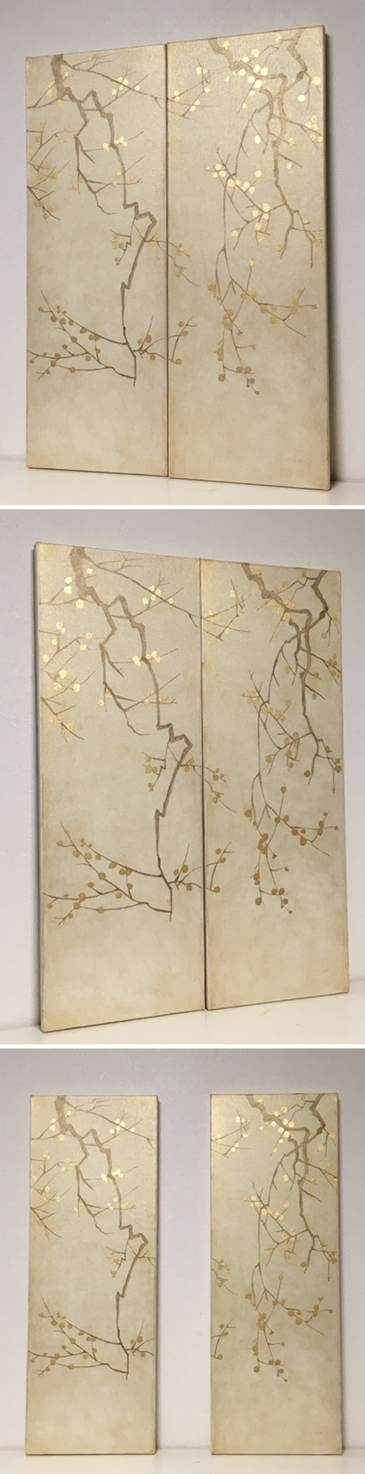 キャンバスに金色の箔と油彩で梅の絵を描きました。2枚ずつでも、1枚ずつ飾ることもできます。後ろに金具はついていません。ご希望の方はお申し付けください。