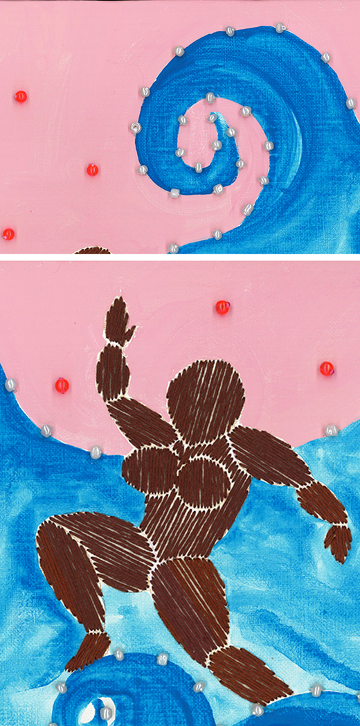 糸、ビーズ、アクリル絵具