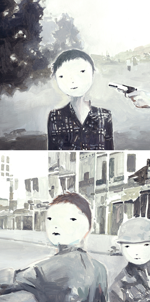考え抜かれた構図と緻密な描写、そしてどこかユーモアを感じさせる人物が特長の清水氏の作品。