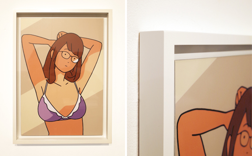 イラストレーター、白根ゆたんぽ氏のデジタル出力+加工作品です。様々な媒体で話題になっている「GIRLS SHOW」シリーズの一作。シンプルな線なのに、見るもののイマジネーションに働きかける官能的な絵柄。とぼけた愛らしさをもった軽みのあるポージング。どれも、イラストレーションの枠を超えた洗練さが新鮮です。