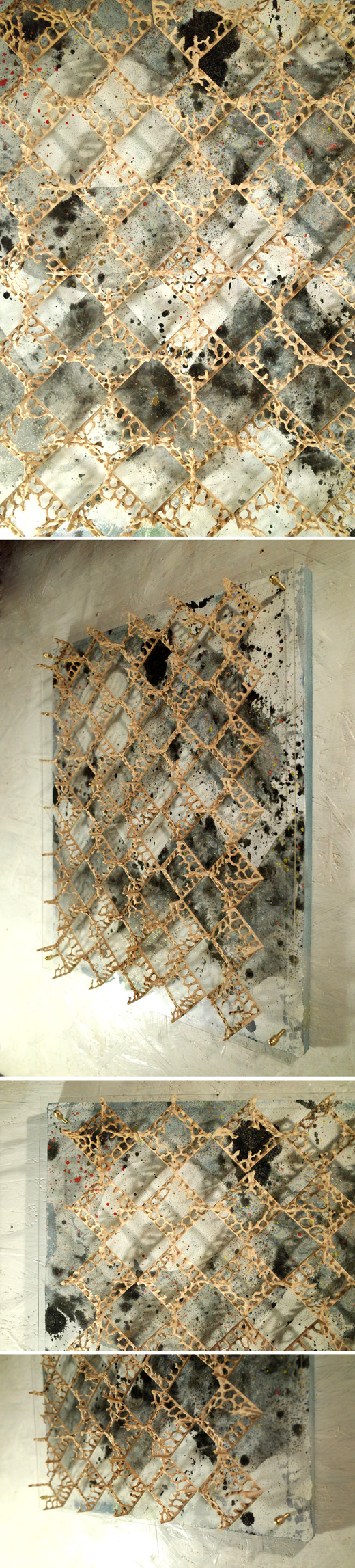 アクリルペイントの上に墨絵、木彫