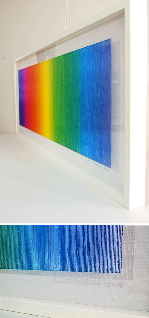 Artists who can draw beautiful gradations are hard to find in this world, right? The true beauty of Minako Ishikawa's work is that the lines are drawn with a single thin acrylic stroke, which is arranged among thousands while subtly changing the color scheme. It is not unusual for her to continue drawing a thin line with the same thickness in a straight line without it thickening left and right.It is surely what God makes. If you think that she paints her work with the colors of the rainbow on a transparent acrylic board, she will change it freely, like drawing with blue on a white canvas, and will attract viewers with her gradations. According to Ishikawa, this work is a work that extracts the "light" that fills the air. In addition, Minako Ishikawa's works feel crafty, beautiful and refreshing without being disturbing, giving us a feeling of openness that you will never get bored of even if you look at it many times. It seems that she has been able to earn high praise on international stage by holding exhibitions in Taiwan several times since two years ago. Despite being time consuming work, her work is highly popular because it is still being sold at a relatively affordable price, so it is advisable to purchase it now. She is one of the artists gathering attention who will grow even more in the future.