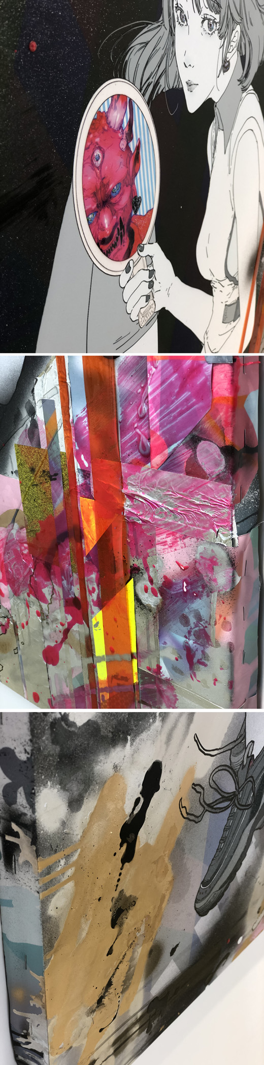 古来より絵画表現に用いられてきました、重層構造をテーマとして制作いたしました。 下絵の段階~数十層ものレイヤーからなる、100%デジタル上で作成したデータを出力したものの上に、描画材を用いての物質を伴う「レイヤー」を新たに追加したシリーズです。 デジタルでの描画という、近年誕生したばかりの非物質的な描画形式を取り入れながらも歴史と伝統のあるアナログな絵画表現に於ける概念を踏襲した作品です。