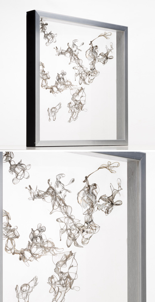 人の眼は見えるものにとらわれてしまいます。ですが何も存在していないと思い込んでいる透明な背景にこそ、何か大切な現象がうごめいている。顕微鏡から覗いた心の細胞をイメージした作品。フレームの中では固定されているピースと流動的なピースが混在しているので、流動的なピースが動くことによって変化する作品です。