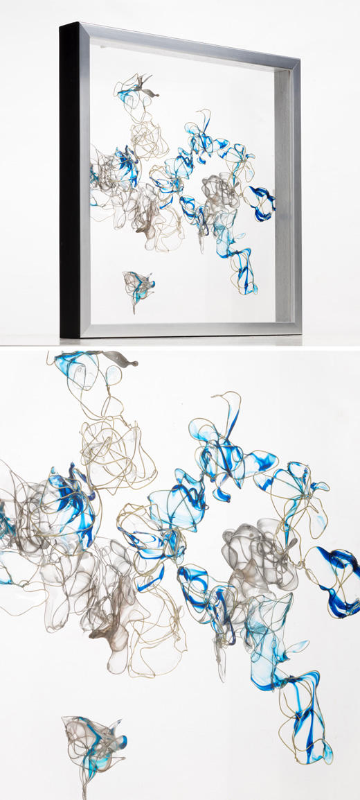 心の細胞~The cell of Mind series~ 人の眼は見えるものにとらわれてしまいます。ですが何も存在していないと思い込んでいる透明な背景にこそ、何か大切な現象がうごめいている。顕微鏡から覗いた心の細胞をイメージした作品。フレームの中では固定されているピースと流動的なピースが混在しているので、流動的なピースが動くことによって変化する作品です。