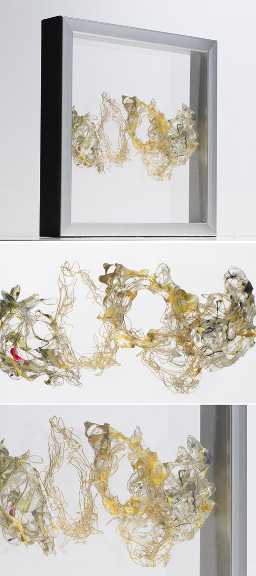 人の眼は見えるものにとらわれてしまいます。ですが何も存在していないと思い込んでいる透明な背景にこそ、何か大切な現象がうごめいている。フレームの中の全てのピースは固定されていないので、流動的なピース達がお互いを支え合ったり、離れたりして、常に新しい作品へと変化する。顕微鏡から覗いた心の細胞をイメージし、偶有性contingencyを表現した作品。