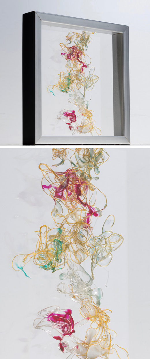 人の眼は見えるものにとらわれてしまいます。ですが何も存在していないと思い込んでいる透明な背景にこそ、何か大切な現象がうごめいている。フレームの中の全てのピースは固定されていないので、流動的なピース達がお互いを支え合ったり、離れたりして、常に新しい作品へと変化する。顕微鏡から覗いた心の細胞をイメージし、偶有性contingencyを表現した作品。