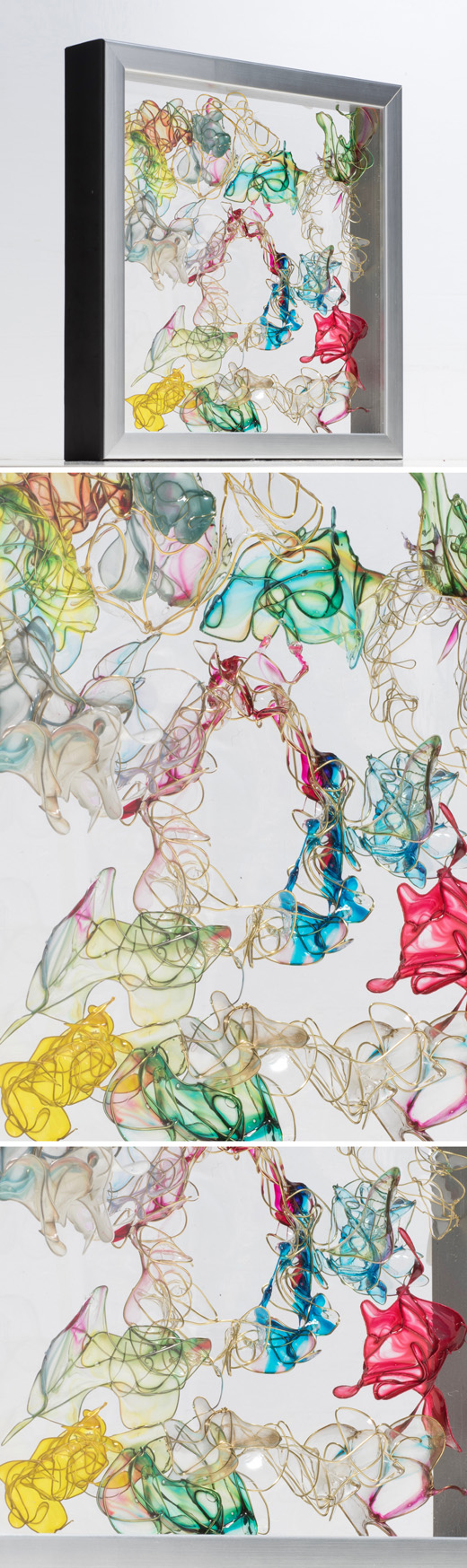 人の眼は見えるものにとらわれてしまいます。ですが何も存在していないと思い込んでいる透明な背景にこそ、何か大切な現象がうごめいている。フレームの中の全てのピースは固定されていないので、流動的なピース達がお互いを支え合ったり、離れたりして、常に新しい作品へと変化する。顕微鏡から覗いた心の細胞をイメージし、偶有性contingencyを表現した作品。
