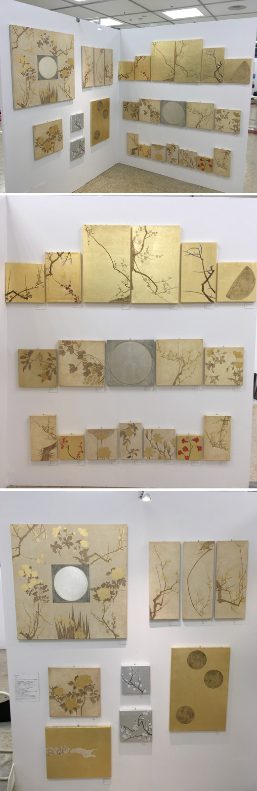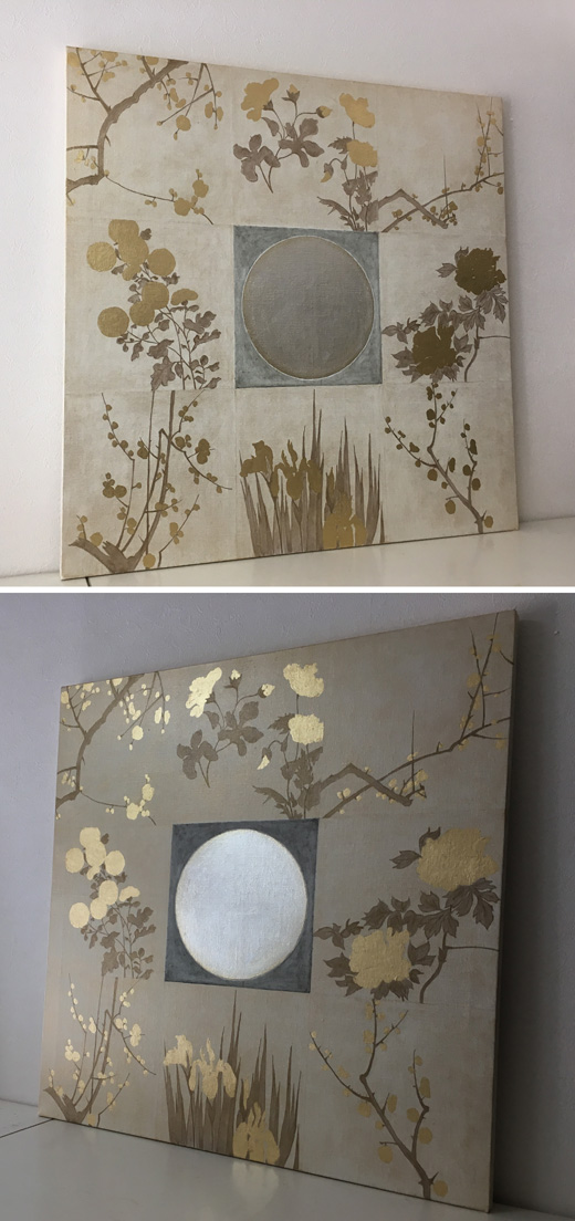 キャンバスに油彩と金色の箔、銀箔を使って四季の草木の絵を描きました。