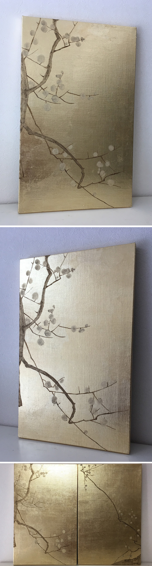 キャンバスに金色の箔を貼り、その上に油彩で梅の絵を描きました。