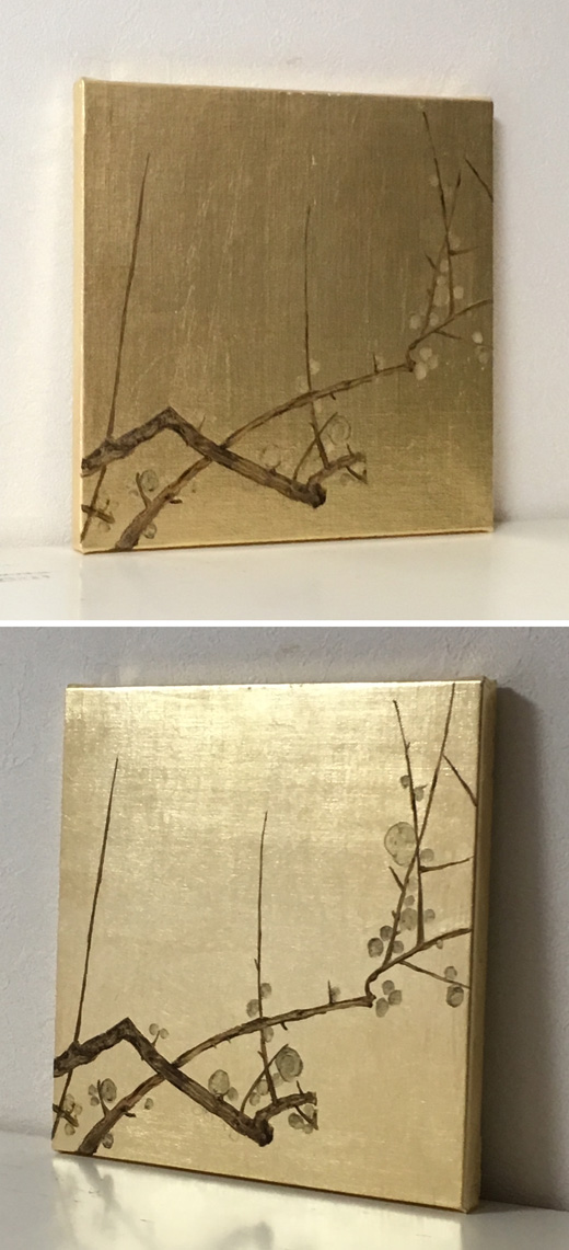 キャンバスに金色の箔と油彩で梅の絵を描きました。