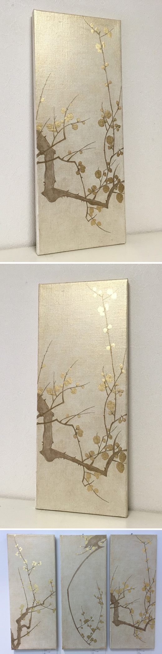 キャンバスに金色の箔と油彩で梅の絵を描きました。
