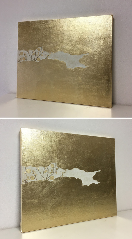 キャンバスに金色の箔と油彩で雲の間から見える梅の絵を描きました。