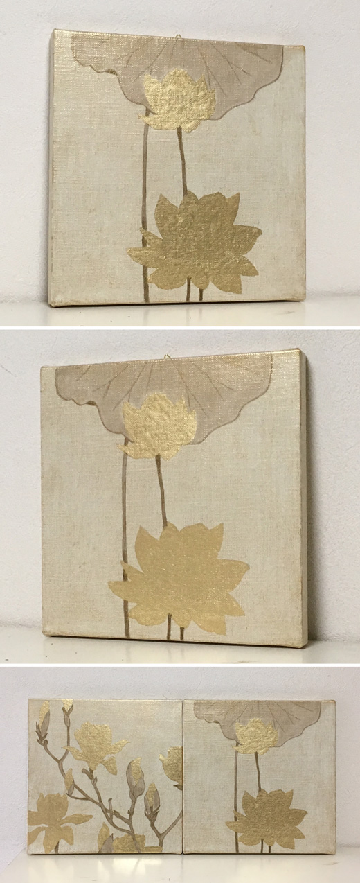 キャンバスに金色の箔と油彩で蓮の絵を描きました。