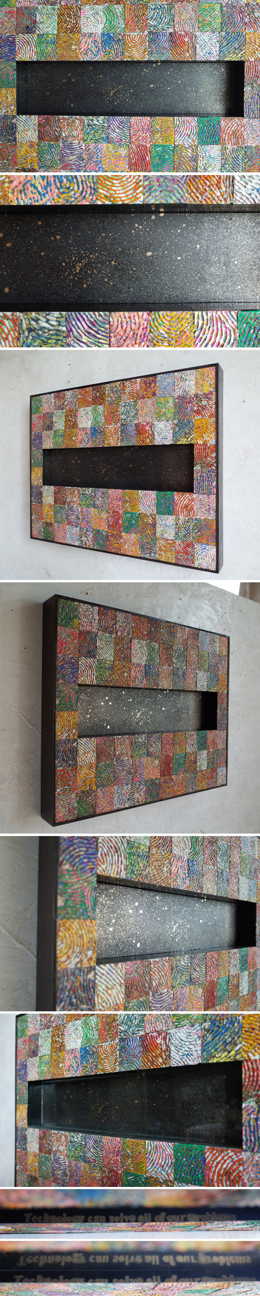 る。アクリル絵の具を幾重にも重ね、彫刻刀で彫り、切断し、再構成することで、そこに