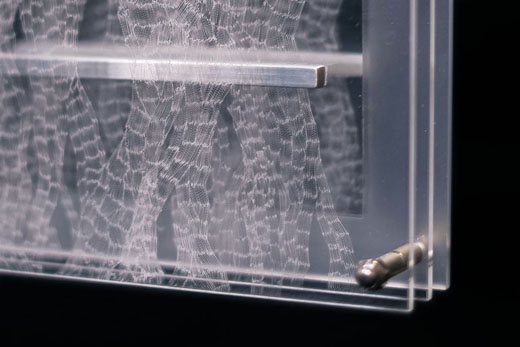 アクリル板を削って描画したものを重ねています。/素材:アクリル板、アクリルミラー板、アルミニウム、アクリル絵の具、ラッカースプレー、金具