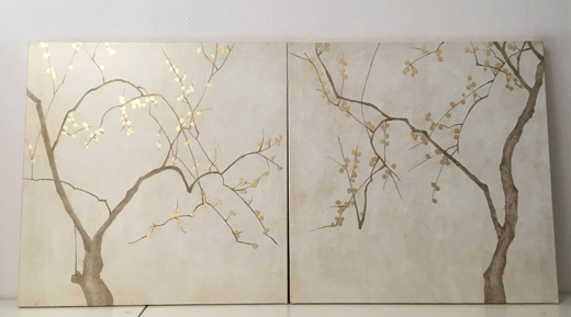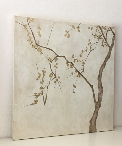 キャンバスに油彩と金色の箔で梅の木を描きました。梅の木2と合わせると横長の梅図が完成します。