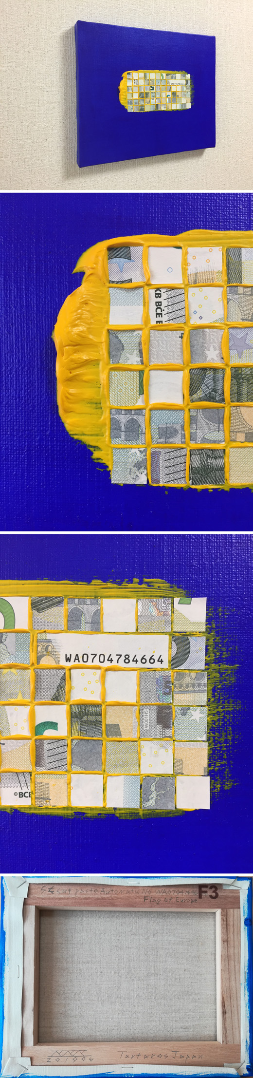 本物の紙幣を使い、通貨制度と紙幣番号により、同じ作品が存在できないコンセプチャルアート。紙幣を切る・混ぜる・見ないで選ぶ・順番に張る、オートマティックペイント作品。
