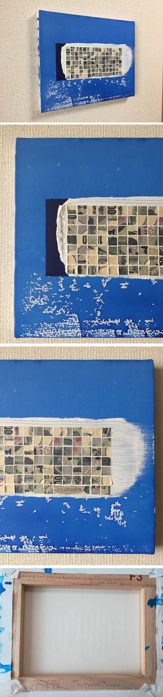 本物の紙幣を使い、通貨制度と紙幣番号により、同じ作品が存在できないコンセプチャルアート。紙幣を切る・混ぜる・見ないで選ぶ・順番に張る、オートマティックペイント作品。