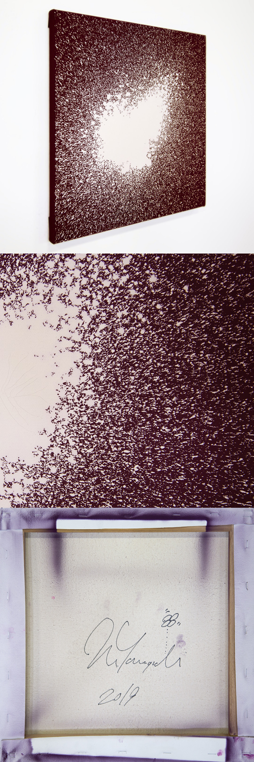 2019年5月より山口真人氏が取り組む"Aero Paintings"のシリーズの初期作品。"Aero Paintings"は湾岸戦争やシリアでの空爆にインスピレーションを受けている。空中から落とされ描かれる抽象的な構図は、実際にドローンを操作することで描かれている。絵の具をタンクに積んだドローンは山口自身によって操作され、絵の具は画面中央付近で落とされる。山口は爆撃によって生まれる放射線そのものを抽象画とした。破壊と美が不条理に融合する様、それは人間の持つ秩序なき欲望なのかもしれない。山口は言語では表現できない人間の奥に潜む感情を絵画で表現をしようとしている。"Night Flight 22:41"は幾度となく行われたペインティングの中から選ばれた作品。画面中央に集中的な描かれた構図は宇宙の彼方に在る銀河のようでもある。