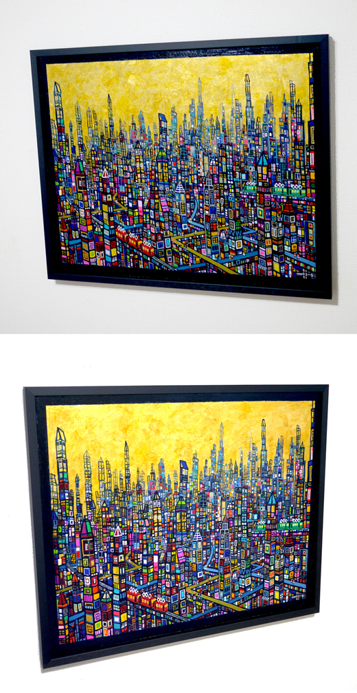 木製パネルに油彩で描きました。油絵の具の他に金箔を使いました。絵の厚みは約1cmあり額装してあります。額の厚みは約2cmです。