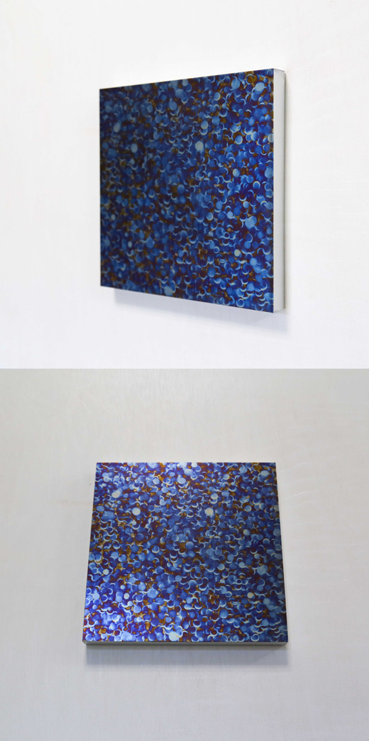 作品の表面に素手で触れると指紋や油分がつきます。油分がつくとその箇所の色の見え方に変化が見られますが、柔らかい布等でふき取ると本来の色に戻ります。側面はアルミなので素手で作品を持っても問題ありません。表面の色味は直射日光に当てても変色せず、経年劣化しません。