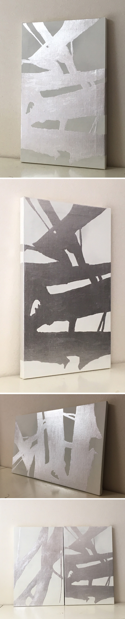 キャンバスに銀色の箔だけで書を基にした抽象画を描きました。縦でも横でも飾れます。Silver1と並べて飾ることが出来ます。