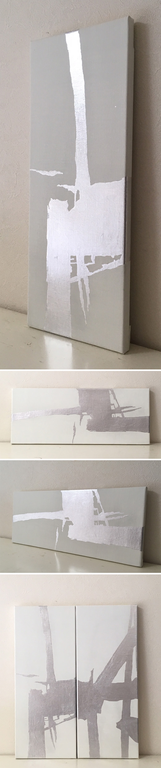 キャンバスに銀色の箔だけで書のイメージを基に抽象画を描きました。縦でも横でも飾れます。Silver4と並べて飾ることもできます。