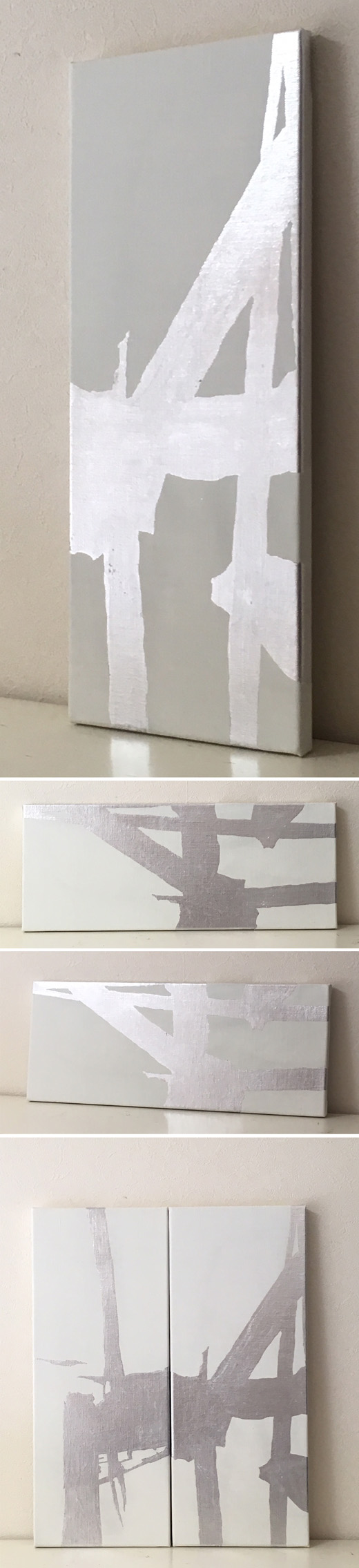 キャンバスに銀色の箔だけで書のイメージを基にした抽象画を着ました。縦でも横でも飾れます。Silver3と一緒に並べて飾ることもできます。