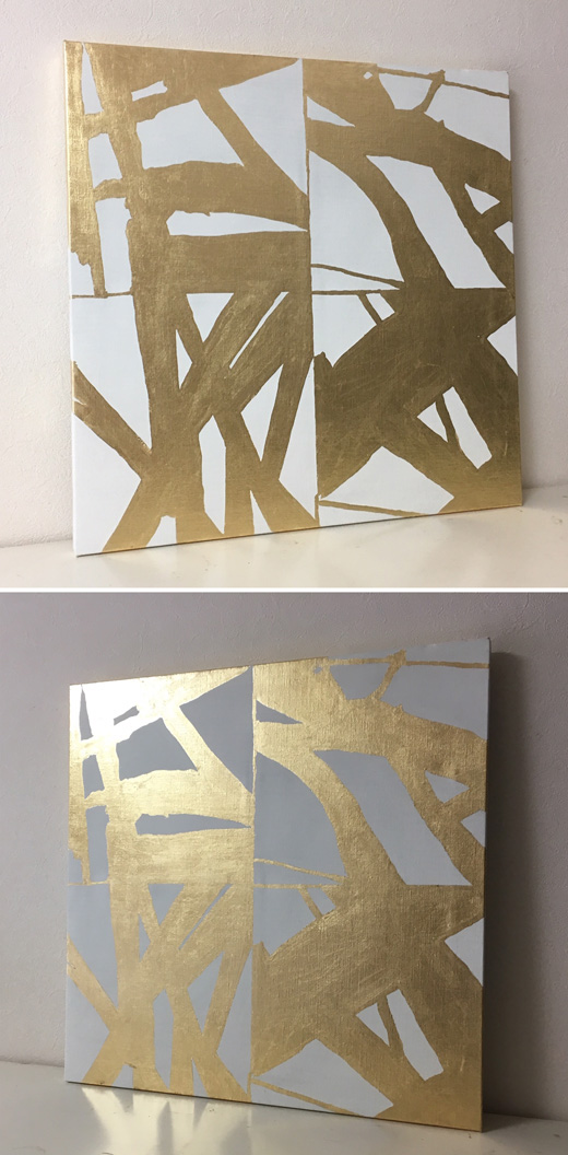 キャンバスに金色の箔だけで書のイメージを基にした抽象画を描きました。