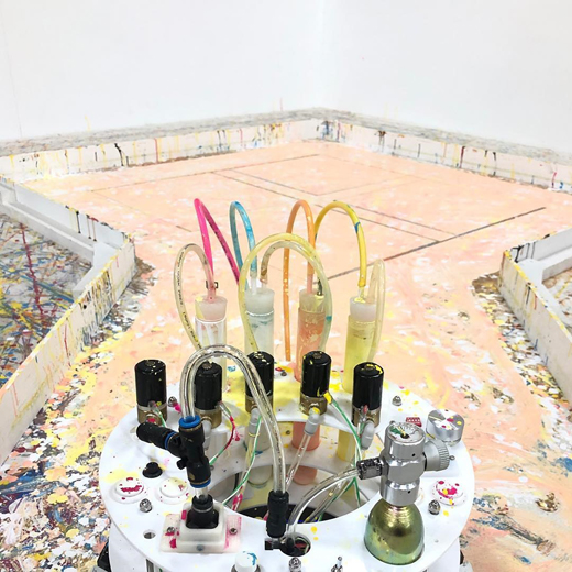 “Hello World”は改造された掃除ロボットが絵画を描くシリーズです。絵の具を垂らすドリップユニットを装着したロボットは、自動的に絵を描き続けます。山口は色彩の選択をし、絵画の始まりと終わりのボタンを押すのみで作品を完成させます。作品は作家自身の作品なのか機械の作品なのか、作家の肖像すら曖昧な究極的に抽象的な絵画となります。