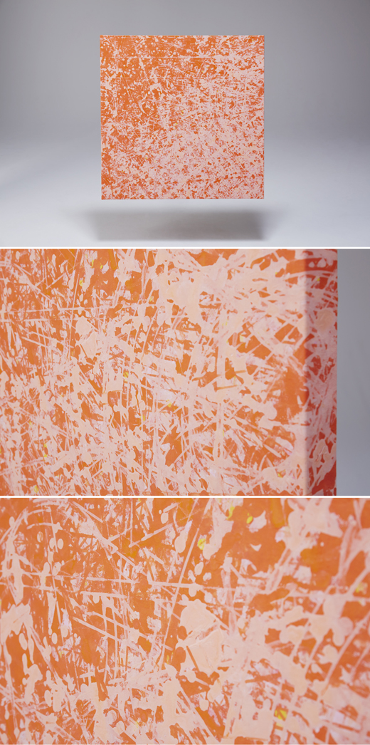 “Hello World”は改造された掃除ロボットが絵画を描くシリーズです。絵の具を垂らすドリップユニットを装着したロボットは、自動的に絵を描き続けます。山口は色彩の選択をし、絵画の始まりと終わりのボタンを押すのみで作品を完成させます。作品は作家自身の作品なのか機械の作品なのか、作家の肖像すら曖昧な究極的に抽象的な絵画となります。