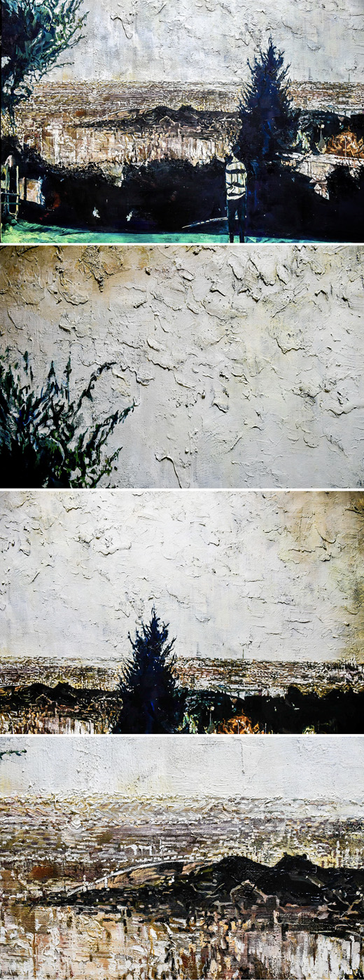 ですが、私はあくまでも撮りためておいた写真の中の景色は、形や色を記録したものとして扱います。なぜなら、私は写真の中に映し出されたモチーフをそのままキャンバスに描き写し取るのではなく、私と絵とのやりとりで出てくるモチーフの捉え方を描きだすことを大切にしているからです。