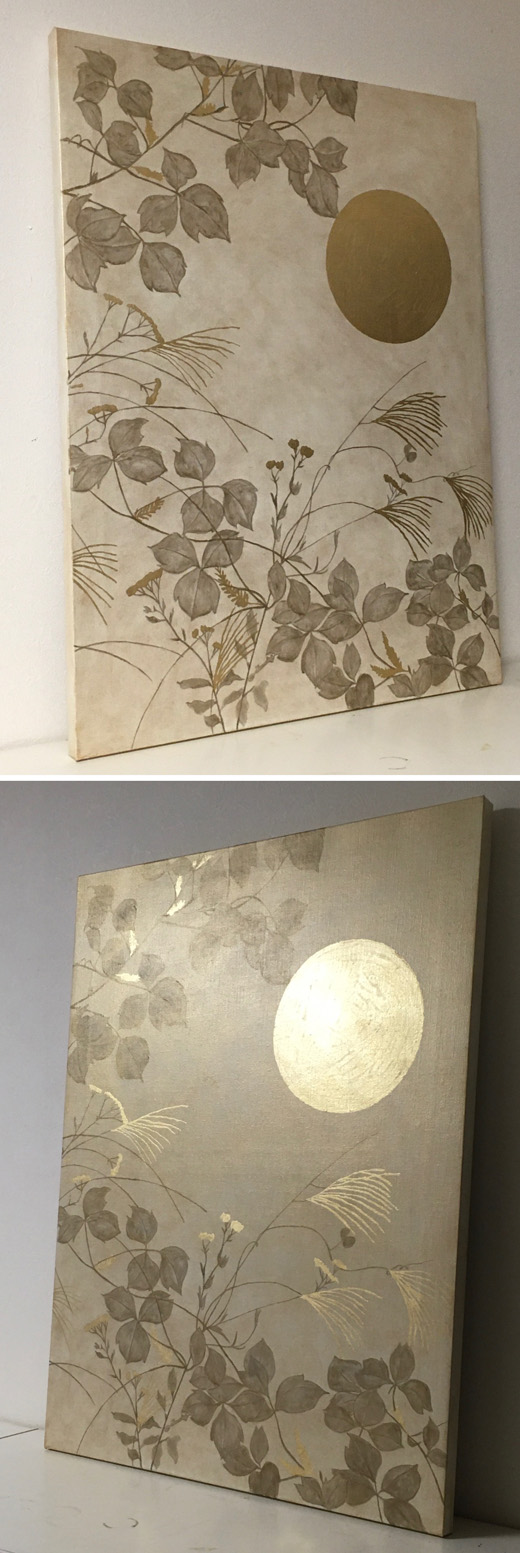 キャンバスに金色の箔と油彩で月と秋草図を書きました。2019年浦安市美術展に出展された作品です。