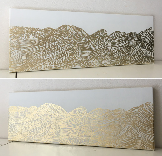 キャンバスに金色の箔だけで横長の波の絵をを描きました。幾何学的な抽象画、または和風の絵としても飾ることが出来ます。