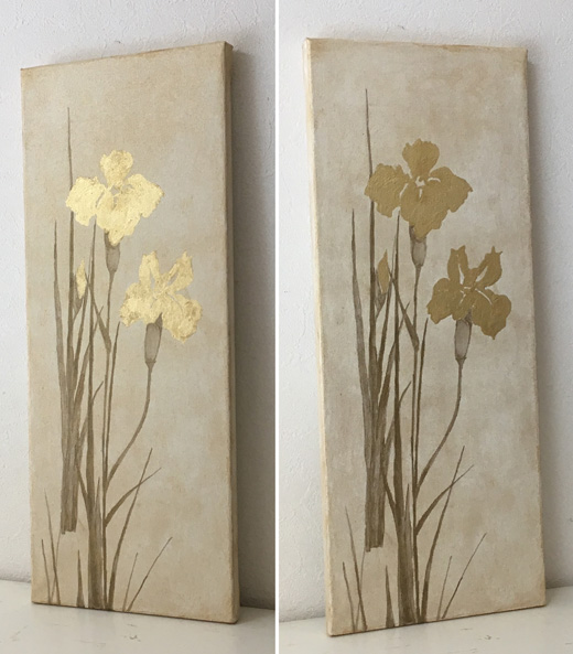 キャンバスに金色の箔と油彩で燕子花の絵をを描きました。