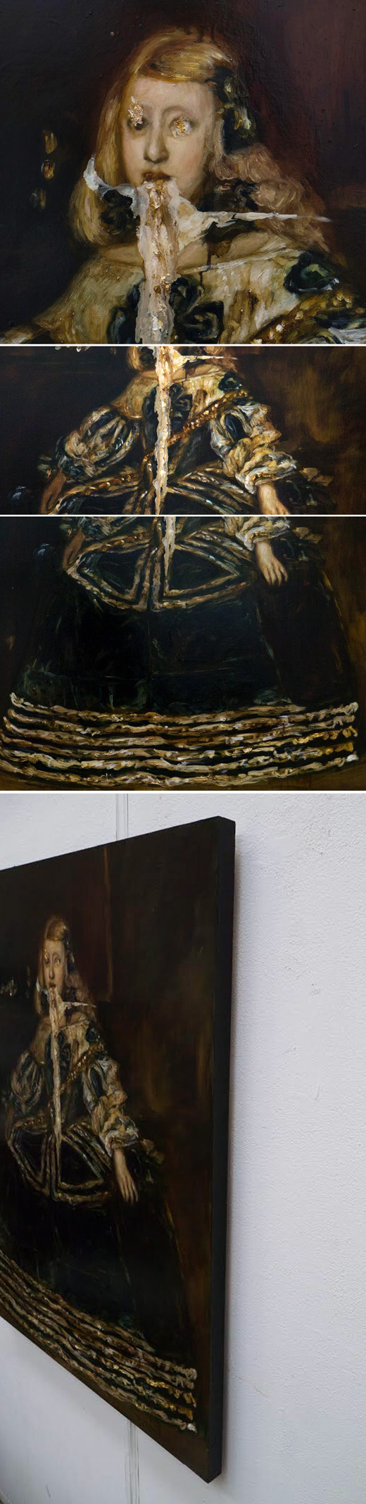 エクトプラズムとは、物理的に心霊現象を起こす霊媒の体の開口部から出ると言われる物質で、現象のことである。 また、テーブルや椅子が空中に浮揚したりする現象の支持物であるとされる。 この作品はベラスケスの描いたハプスブルク家のマルガリータ王女をエクトプラズムさせてオマージュした作品だ。