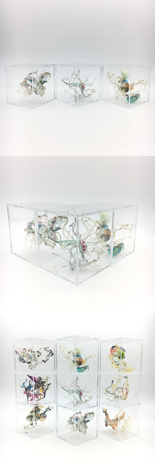 人の眼は見えるものにとらわれてしまいます。ですが何も存在していないと思い込んでいる透明な背景にこそ、何か大切な現象がうごめいている。標本になった心の細胞をイメージした作品。
