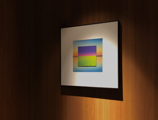 landscapeシリーズ:油彩と写真を組み合わせています。その一瞬にだけ見せる風景の表情を、正方形というある種完璧な形の中に閉じ込める。変わりゆく風景の中にも静かでゆるぎない美しさを表現している。 (↓額装イメージ)