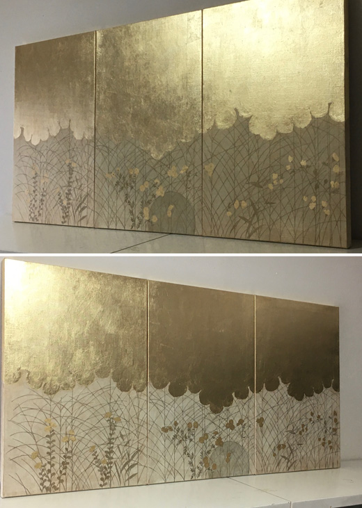 キャンバスに油彩と金色の箔で春をテーマにした武蔵野図を描いてみました。3枚画となっています。