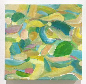 アクリル絵具や油絵具による塗りのつぶれやかすれ、色の重なり合いや模様のようなものたちが作り出すユニークなハーモニーが、彼女の絵の最大の美質です。その時々の彼女自身が置かれた環境や内面世界が手から筆へと転送され、色合いはときにオーソドックスな油画の伝統を思わせるメランコリックな情緒をまとい、特にはストリートアートのようにポップで鮮やかな躍動で見るものの心を震わせます。