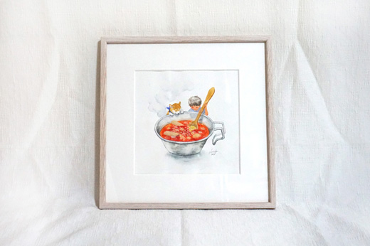 おもに森の生き物を題材にファンタジックな水彩画を発表し続けている村田なつか氏。童話本や絵本のワンシーンを思わせる場面構想力は、透明水彩の独特な滲みとマスキング技法とを駆使することで、より洗練された境地に達しています。動物イラストレーションの王道を承けつつ、自然の陰りや発光感まで豊かに表現できる余白の巧みな使い方が印象的。可愛らしいだけではなく、鉱石や食べ物と動物との組み合わせも試みるなど、グラフィカルでシュールな着想の面白さにも特徴があります。本作は、彼女の個展「SHIBACAMP」(2018年)で展示し好評を博した原画です。