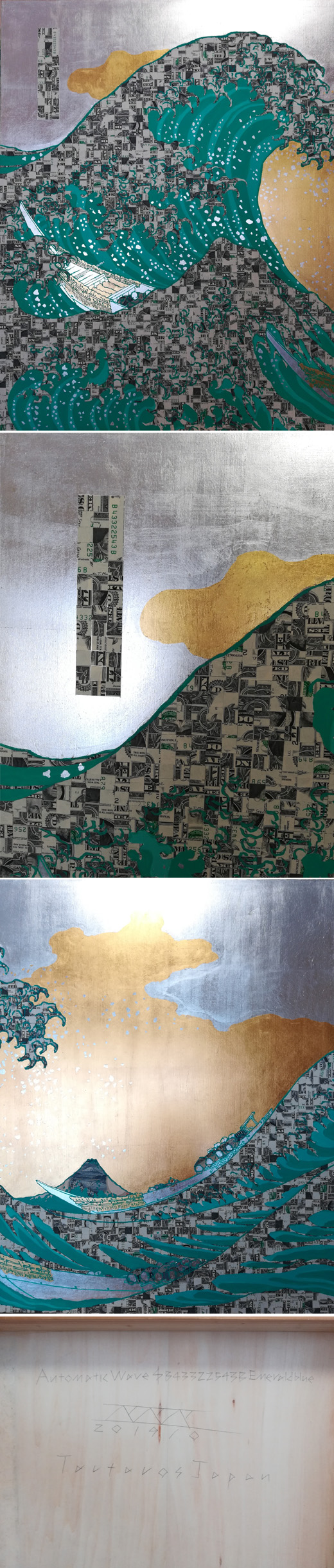 同じ構図で摺り版の色違いが作られる浮世絵のコンセプトの引用により、構図は共通でありながら、紙幣や色により全てユニークピース作品です。紙幣をコラージュした画面は同じパターンは絶対に作れ無いAutomaticPaintingの手法を用いています。