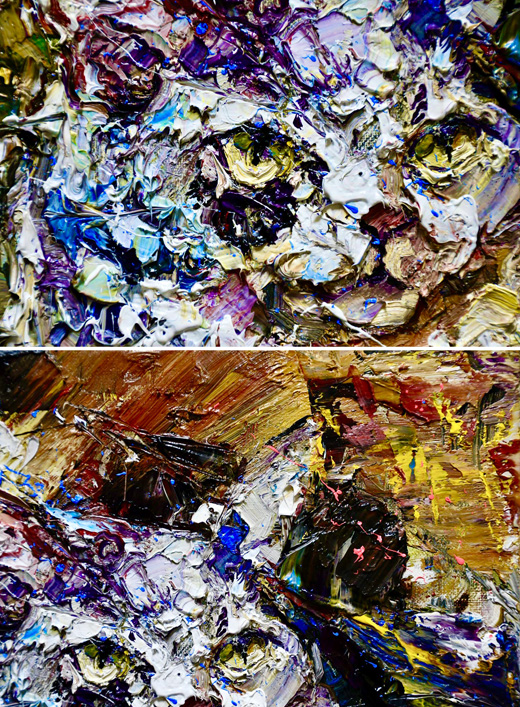 私は、その揺れ動く心を、「衝動的」とも言える物質的な筆致を重ね痕跡として残すように描いています。