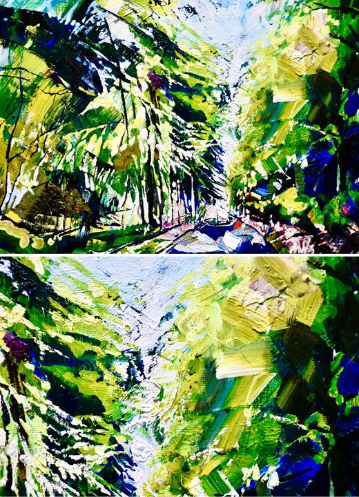 ですが、私はあくまでも撮りためておいた写真の中の景色は、形や色を記録したものとして扱います。なぜなら、私は写真の中に映し出されたモチーフをそのままキャンバスに描き写し取るのではなく、私と絵とのやりとりで出てくるモチーフの捉え方を描きだすことを大切にしているからです。